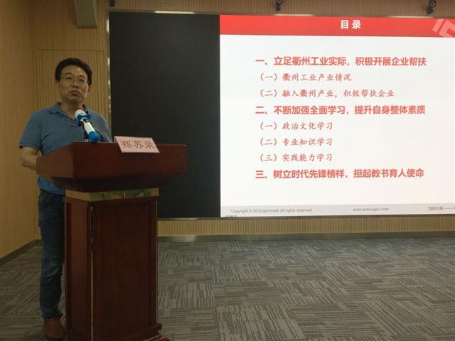 6月12日下午,我院党总支组织专题学习,邀请衢州市突出贡献中青年专家、市特种设备检验中心主任郑苏录为全体教师讲授党课。 郑苏录以《不忘初心 凝聚汗水 静待花开——融入衢州产业,积极开展帮扶》为主题,结合衢州建市三十多年来的变化与取得的成绩,从“立足衢州工业实际、积极开展企业帮扶,不断加强全面学习、提升自身整体素质,树立时代先锋榜样、担起教书育人使命”三个方面进行了阐述。他充分肯定了学校“双走进、双服务、双促进”专项行动的开展,指出best365网页版登录官网与衢州市特种设备检验中心有着长期的良好合作,成效明显。在应用型本科高校建设中,他鼓励教师们更多地熟悉浙江省情、衢州市情,“放下面子,扑下身子,甩开膀子”,讲好“地方话”,服务衢州创新驱动,担当起为衢州工业发展尽心尽职的社会责任。结合自己的成长经历,他强调教师们要在“传道受业解惑”之外,做好新形势下的学生的思想政治教育工作,在新时代有新担当,用新作为“静待花开”,结出硕果。